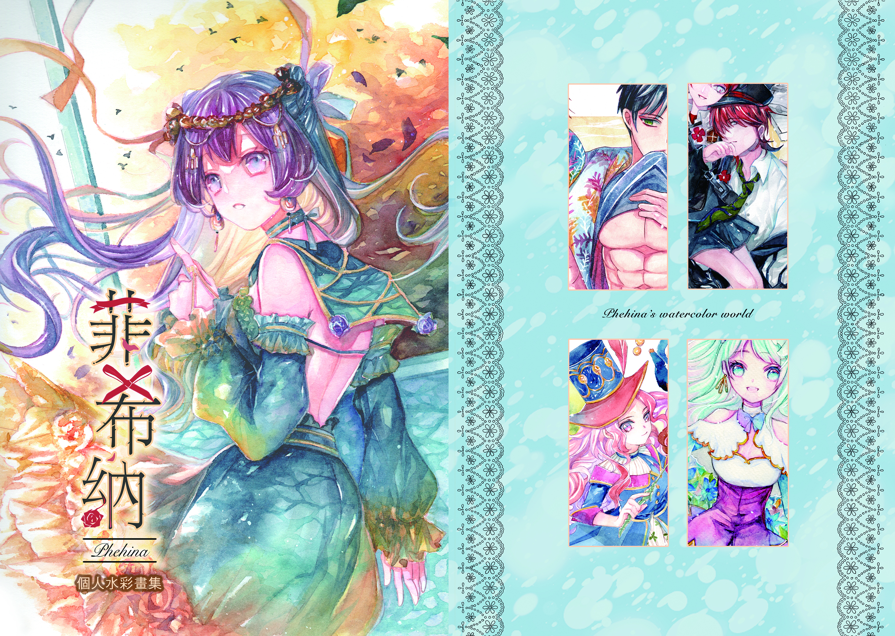 裡面收錄了近年來菲上課示範以及原創角色、二創遊戲角色的水彩插畫